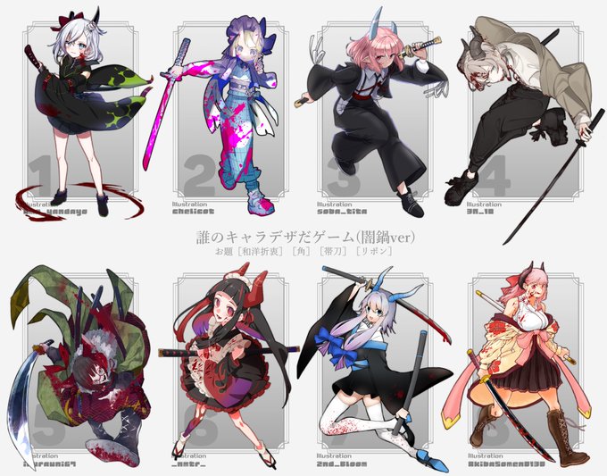 #誰のキャラデザだゲーム お題[和洋折衷][角][帯刀][リボン] 総勢8名にて各自デザインしたラフを交換をし 私は7番の子を担当させて頂きました! 私のデザインは何番かアンケートにて予想していただければと思います。答え合わせは明日以降となります。