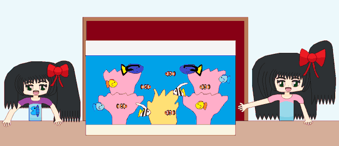 飼っている魚を眺める姉妹の絵。 海水魚は滅多に見れない。