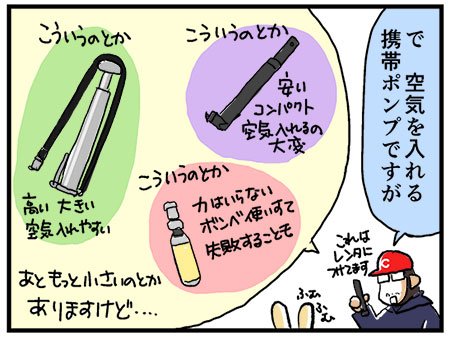 [クロポタNOTE・4コマ]クロスバイクな日々58・パンク修理講習5 https://t.co/lO0k5wNJ4z 携帯ポンプいろいろありますが私に使えそうなのは……一択でした(笑)