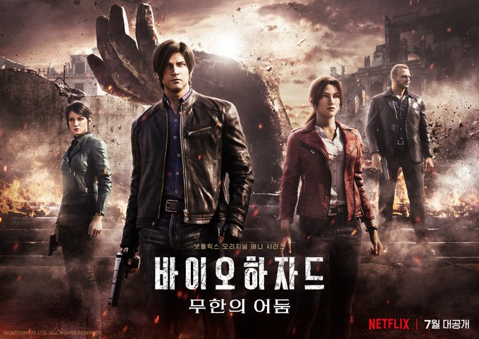 <바이오하자드: 무한의 어둠> 7월 8일 넷플릭스 공개. 좀비가 출몰하며 순식간에 펼쳐진 아비규환 속에 레온 S. 케네디와 클레어 레드필드가 미국 정부의 음모를 파헤치고 최악의 공포에 맞서 싸워나가는 이야기를 그린 풀 3D CG 애니메이션.