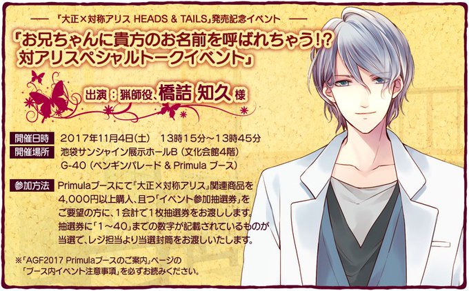 11月4日(土)13時15分よりPrimulaブース(G-40)にて「対アリスペシャルトークイベント(出演:猟師役 橋詰知久様)」を開催致します
