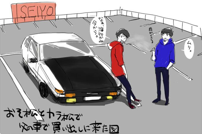 イニDのもろ影響で車みると軽率に免許持ってるおそ松兄弟にあててしまうしがないオタク。 大きい買い物の場合のみ車で週末にドカっと買ってくるんだけど、今回はじゃんけんで負けたおそ松とカラ松が買い出し組。屋上駐車場で一服して欲しい。