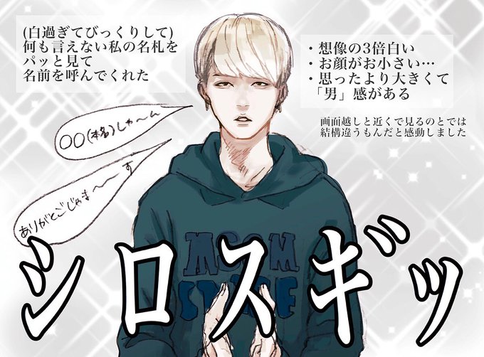 🤝昨日の握手会のレポ(感想)7部SUGA🤝 (こっちから名前呼ぶぞ…!)って思って入ったのに目が合った瞬間に白過ぎて意識が飛んだので握手したかも覚えてないです… 剥がしが早すぎて握手出来たのは1.5秒くらいでしたが実物の衝撃は大きかった