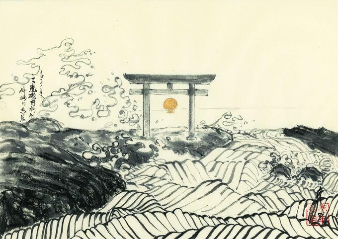 水墨画【神磯の鳥居】 大洗磯前神社の神磯の鳥居画です。日の出として金泥使ってみました。 #隔日お絵かき