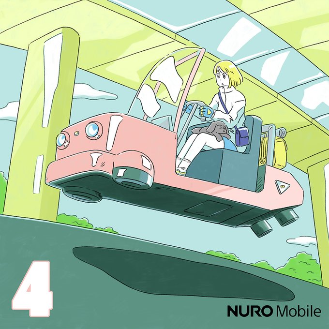 NUROモバイルの公式Instagramアカウントにて、描き下ろし月替わりカレンダーを担当しています。4月は心地よい春風を感じながら、空飛ぶマシンに乗ってドライブしているところを描きました。