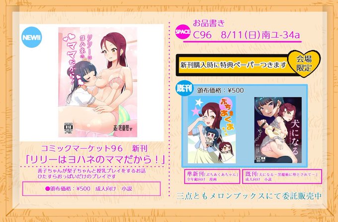 C96新刊の表紙を公開します!今回の七星なす@NAS_X先生による挿絵つき!今回はよしりこ授乳プレイオンリー小説となっております