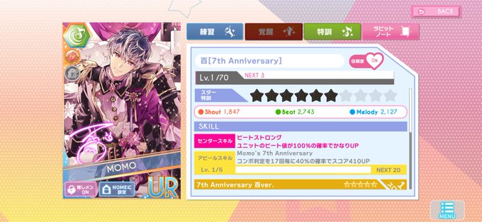 マネージャー歴23日 モモとバンちやんもいるよ! あ、本編5部最後まで読了済だよ!! (どのソシャゲを始めてもやることは一緒のみかc) #アイナナ