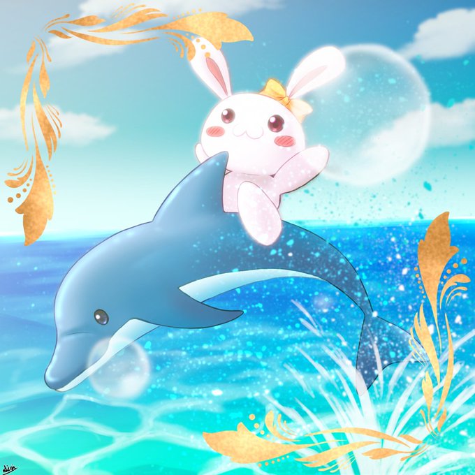 マイアイコンのうさぎ的生物に、拙作「サマースマイル・アゲイン」の象徴とも呼べるイルカのコラボ🐰🐬