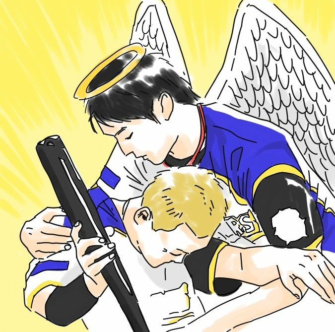 お母さんに2枚目を見せたところ、「天使がお迎えに来てる図にしか見えない 描いて」とのことでしたので描きました 今となってはもう聖画にしか見えないです
