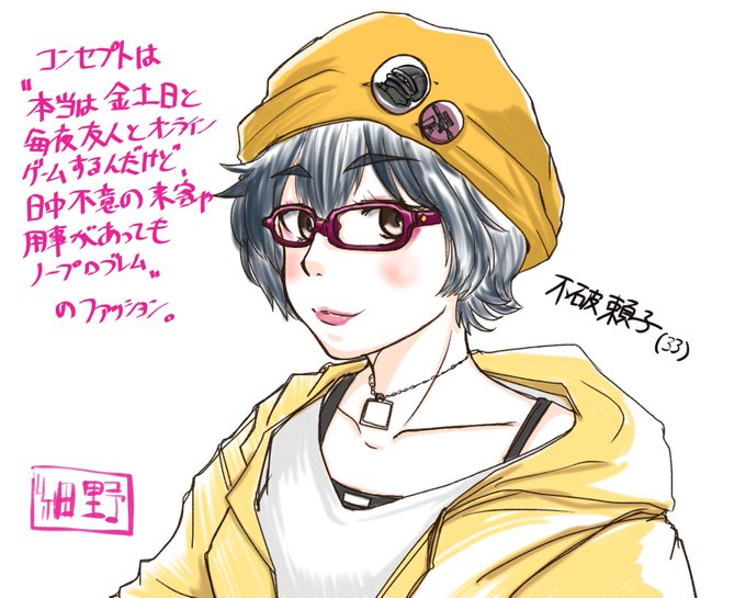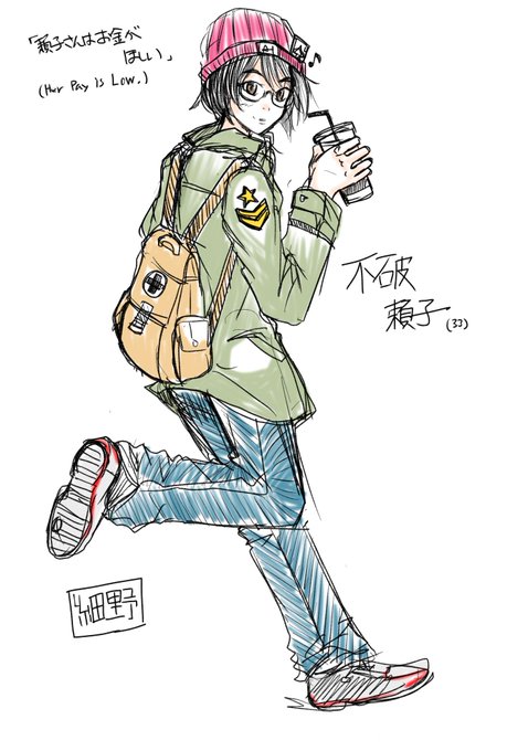らくがき。週末は家から出ずゲーム三昧の予定だから服装はどうでもいいんだけど、不意の来訪や用事にも対応できる、スペツナズ級に即応性の高いファッションの頼子さん。