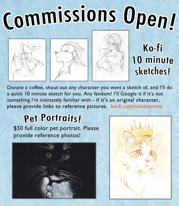 #Commissions are open once again! Three slots were taken via waitlist, TWO remain! First come, first served, but if you miss out, never fear, you'll have first dibs at any open slots.