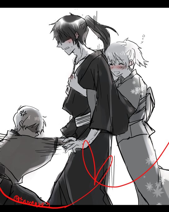 #土ミツ 「ーーーーー?!」 酔っぱらって上機嫌で抱きついてきたミツバさんに心臓を掴まれて、下の急所はそれをみて怒りの総悟に掴まれて死にそうになっている土方さん ※カラーで描きたかったけど挫折した💀