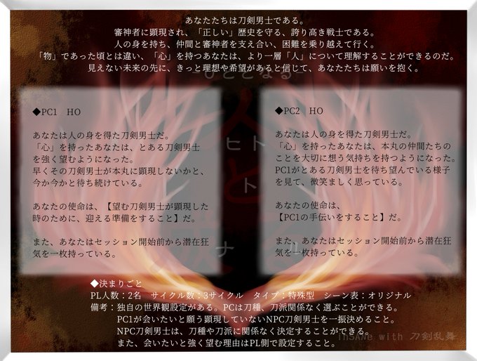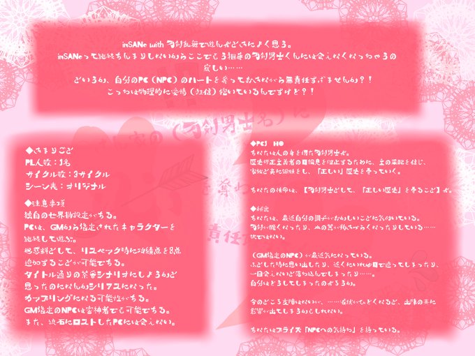 これは刀さに口説きシナリオですと胸を張って言える訳ではないですが、みなさんとっても素敵なRP!!口説きPを渡すのが捗ります。導入に1番時間使ったの笑ってます。次回も楽しみ!