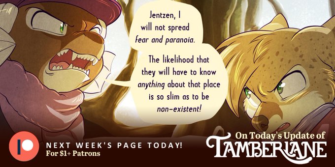 Last Reminder, Patrons! Catch up to page 188 of Tamberlane on #Patreon today! https://t.co/OATzdvi5UD Please also consider pledging to our #Kickstarter!! #webcomic #cute #animals #art #fantasy #TamberlaneComic #MakeComics