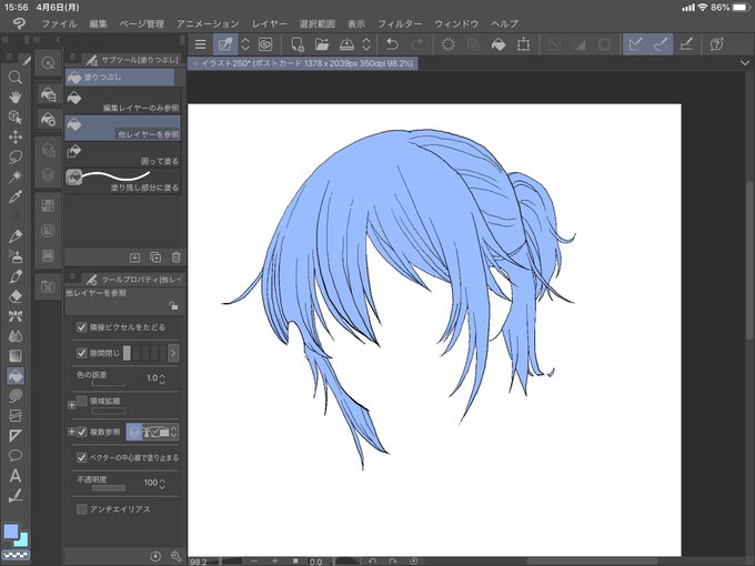 ②髪の線だけ残して主線の上に置いたレイヤーに髪塗り