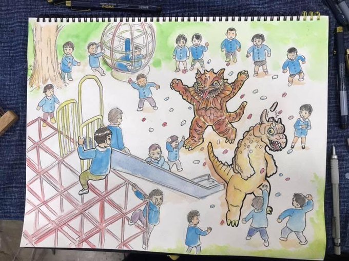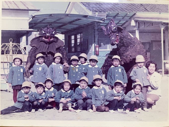 幼稚園に来た怪獣と、小学校6年生の時の集合写真。