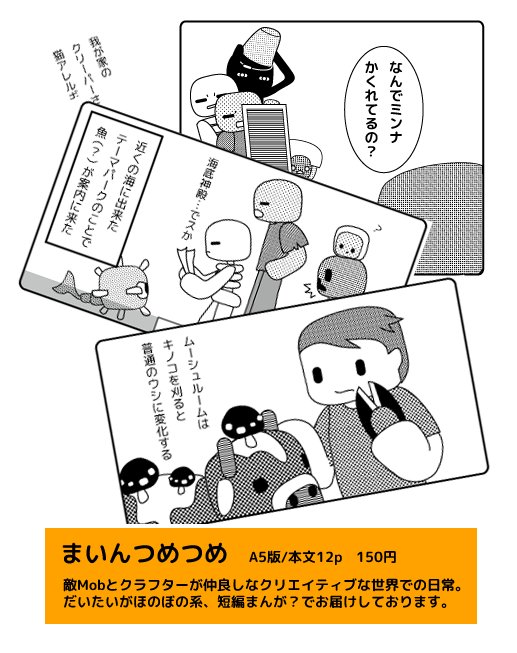 案内を出した気で忘れていた新刊情報です。『まいんつめつめ』A5版本文12p/敵Mobたち(とクラフター)が仲良しな日常をお届けするコピー誌です。超会議両日、9ホール『超まいくらひろば』にて頒布予定、よろしくお願いします~ #まいくらひろば