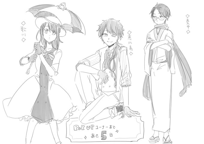 歌川、恵比寿、秦中の描き下ろし衣装も考えてみましたー! https://t.co/XLORsBtE45