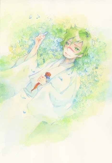 これも三原色縛り塗りの練習ですね。委任一発ネーミングの六角家の優さん。昨日ラフであげた絵を元に。月光荘の三原色のみでやったんですが、混色してもあまり濁らないのがすごいな、と。