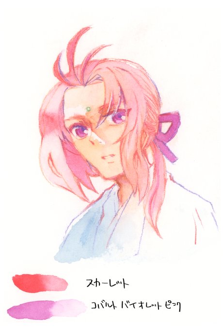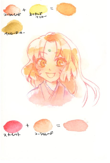火髪と火目のイメージと思って買った月光荘透明水彩、塗り実験してみたけど髪に関しては自宅子はオレンジ寄りの子が多いので、しかし画面の色には似ているのかもしれない。あと今日悩んでた土髪の塗り練習も。スカーレットとコーラルレッドは混ぜると非常に可愛いピンクができます。