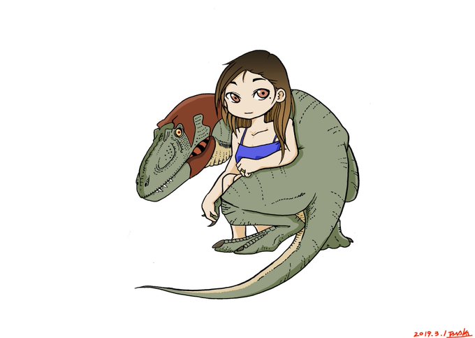 新作( ・∀・) カレとの朝2の女の子とティラノサウルス亜成体デフォルメ。
