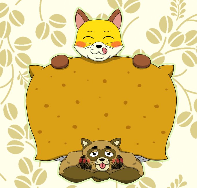 狸兄弟『恵方巻』 茶太郎「もぐもぐ(恵方巻うめぇ~🎵)」 刑三郎「もきゅもきゅ(今年は南南東なんだっけ。)」 又次郎「もくもく(行儀は良くないけど・・・今日くらいは良いかな///)」