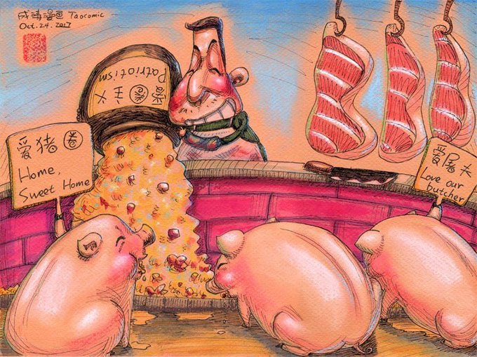 美国有很多讽刺漫画家,专门尖酸刻薄的讽刺政客,有些供职媒体,有些自由。没啥特别很受尊敬。中国?民国曾有很多,丰子恺、沈泊尘……今天呢?极少了,都被维稳系统消灭的差不多了,剩下的要么提心吊胆要么身在海外。有这手艺的,画别的题材不愁没钱赚。我缺赚钱的机会吗?笑话~画讽刺,是历史责任感