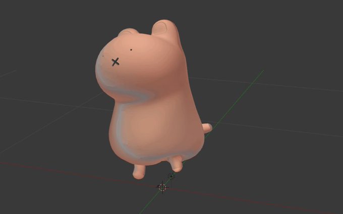 こぶたの骨はこんな構造。ごく普通のIKで足を動かしています。ただしかなりのおでぶさんなので補助ボーンを仕込みました。あと口はフェイシャルボーンを追加しただけ。ウエイト修正は一切なしの自動ウエイトのみ