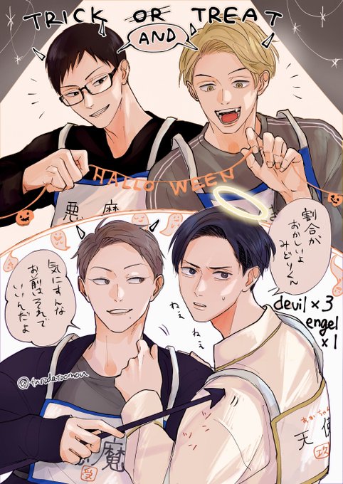 創作BLの🎃その2 ゼッケンで内面を二分して雑ハロする四人(仮装より飲むことが目的)。
