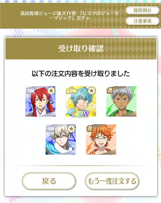 残りのとっちゆきさまゆーくん狙いでやったらこれで!?ってなって、もういっそとジョージガチャしたら一発で何このKPR率、、死ぬの?