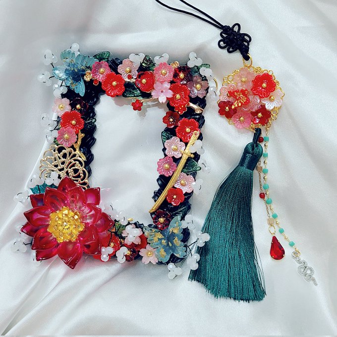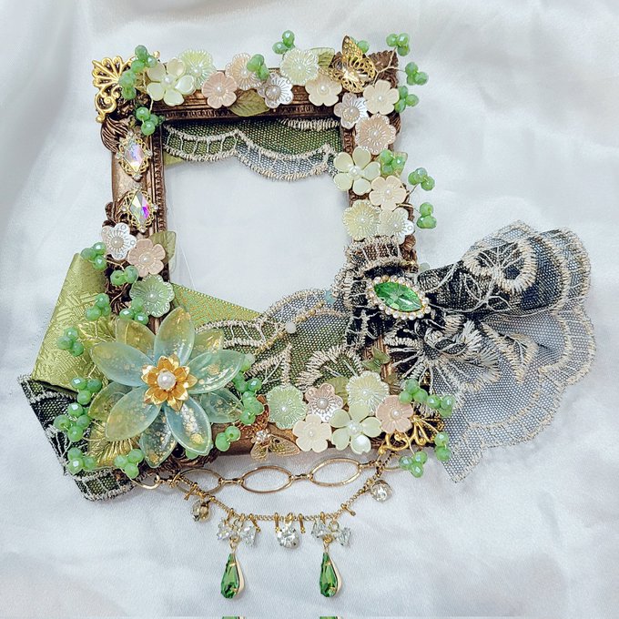금빛 메탈 레진 액자와 올리브색상,검정색 금박 레이스를 착장과 비슷하게 붙여주고 탑꾸아래에 치마의 장식과 비슷하게 제작해 달아드렸어요😘