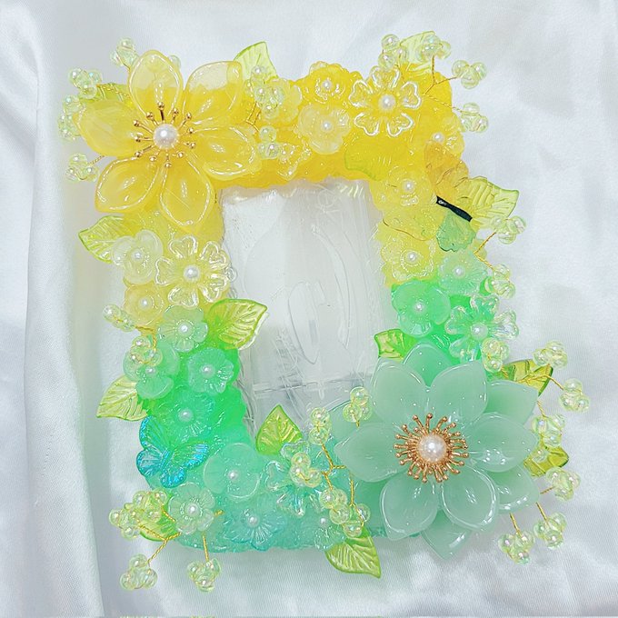 노랑,레몬,레몬연두,연두색으로 그라데이션한 글리터바탕 위에 바탕색상과 비슷한 꽃 색상들로 구성해 붙여드렸어요😊