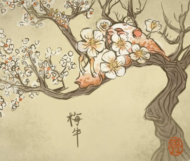 547番目。梅の時期になると、海から山へあがって梅の花を食い荒らす。 体に梅の大輪を咲かせて良い香りを放つので、これはこれでいいという人もいる。 #畳百鬼夜行絵巻