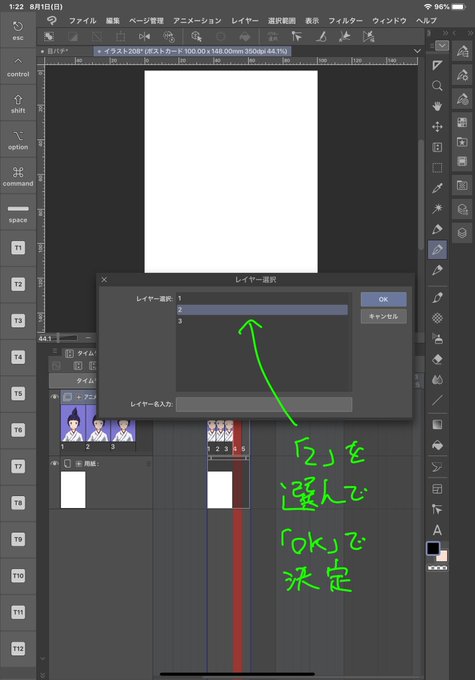 ⑮何も表示がない「4」のコマを選択(ちょっと細くてタップしづらいけど頑張れ)して赤い状態にしておいてレイヤー選択ボタンを押す(画像参照)
