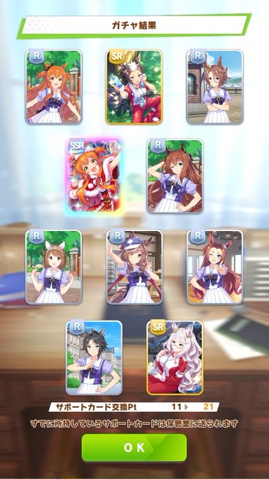 グラス☆5になってた、意外と溜まっていたのねwそして今日の10連!マヤちんありがてえ!そしてリッキー育成中にイベントサポカハヤヒデのイベントより…これ脱字だよな?「子どもたち」だよな?だとしたら疲れているかもなあ