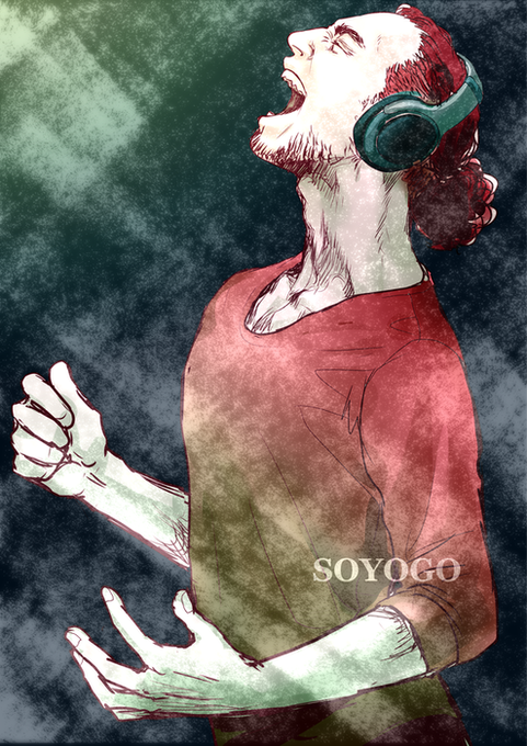 #ヒゲ版深夜の真剣お絵描き60分一本勝負 フライングにて失礼します お題【ヘッドホン】 いい年してノリノリのおっさん