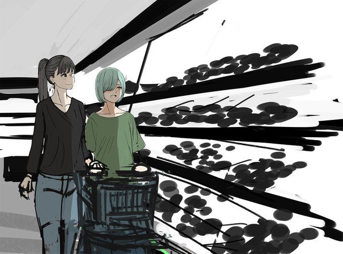 ナギカゲがスーパーで買い物してる感じの絵を描きたかったけど途中から筆が極端に遅くなってしまい1週間かかってこの進捗具合なのでなげます なまじ二人の顔が良く描けそうだっただけに口惜しい…