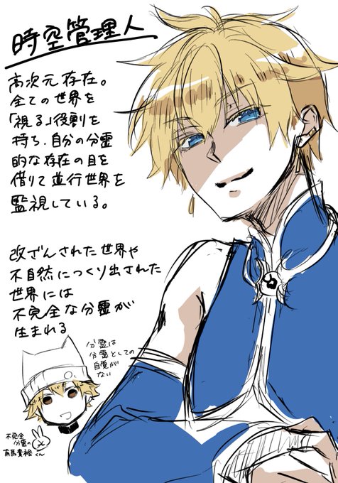 隼とか始さんとかの設定を割とすんなり噛み砕いてるけど、それってたぶん昔そういう話をつくってたからだよなぁ……と思い出しながらかいた当時のオリキャラ。時空管理人のほうは漫画で物語管理人のほうは舞台で登場させたのでデザインの方向性がだいぶ違うというあれそれ