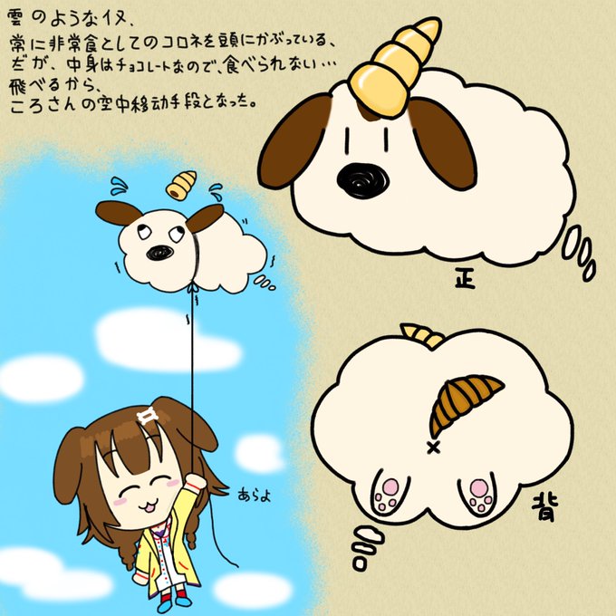 自分が考えたころねすきー、 今までのデザイン印象は強烈すぎて考えにくくなったね、 設定も加えた、 もう一度見ると、僕の字が汚い(ノД`) #私のころねすきー案