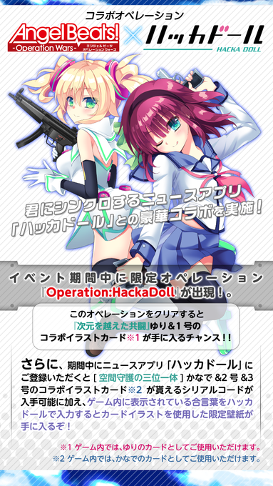 【お知らせ】そして、ニュースアプリ「ハッカドール」とのスペシャルコラボイベントも同時開催!イベントクリアでゆりのカードが、ハッカドールをインストールするとかなでのカードが入手できます! #ABOW