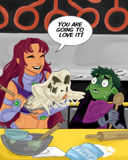 Starfire’s always serving up smiles! 😅 What do you think she’s making? 🧑🍳🧡 #TeenTitans #starfire #beastboy