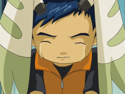 'what's wrong? what's wrong? aw...your eyes are leaking, takatomon. why?'
