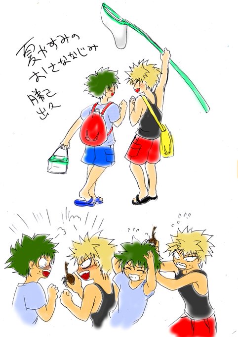夏休み終わりだから夏っぽいおさなな描いた かぶとむしがデクのモジャ毛にからまってそれをとってあげるかっちゃんと、スゲーかっちゃんスゲー!ってなってるデクかわゆ