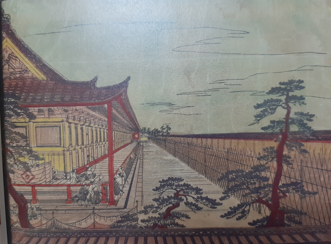 この円山応挙の絵は一点透視図法で描かれている。 日本では遠近法で描かれた絵を楽しむための仕組みまもあった。 こういう鏡とレンズを備えた覗き眼鏡で絵を見ると、絵が立体的に見えるようになる。