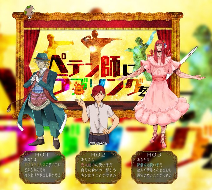 『ペテン師にラブ・ソングを…』 KP:田中 PC/PL HO1スウェイ・マイケル・ダラー/タルトさん HO2炎耶/古月くるみさん HO3姫野合歓/くろ茶さん 始まりました1日目おつかれさまです~!!! ”””濃い””””炎耶さんはもうその位置が逆に”””濃い”””かわいいいのちたちめっちゃかわいい。来週もがんばれ~!