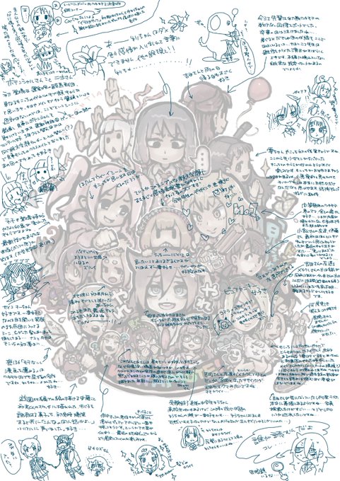 こんなかんじで最近描いてる集合絵にコメントつけたverを見開きにしたりして本にしようかなと...コメントは手書きかつちっさくて読みにくいかと思いますが抑えられませんでした....内容はともかく読み応えはあるかと思います....