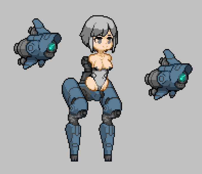 デザインが服以外できた。 基本ポーズを減らすため武器はファンネル方式にした。 ファンネル式だとスプライトとかゲームオブジェクトを分けやすいから、種類も後で増やせるし。