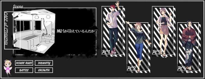 5/7 《風呂が冷えているんだが?》 作:太子様 KP:いちご PC:榊 涼平(Lentoさん) 屋我 恵(arcanaさん) 白井 らな(みょん#さん) 山城 凌馬(はりゅさん) 久しぶりに幼なじみ達にまわしてきました わちゃわちゃしてて楽しかった!