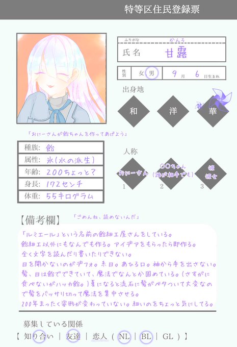 記憶喪失で行き倒れていたところを(私の三人目キャラシの)甘露に拾われ生活し始めました。