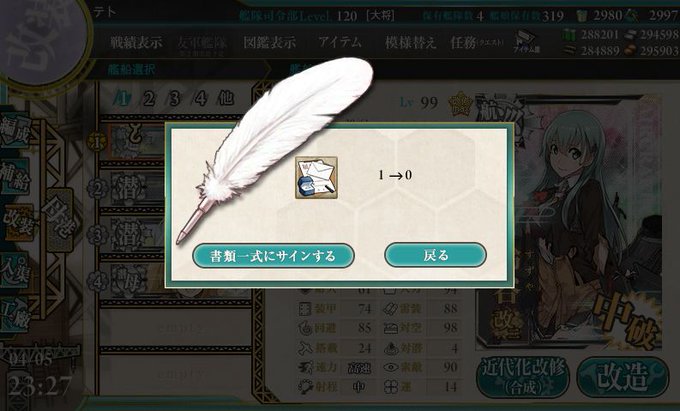 85あれば大丈夫だろうとおもったら、87で足らんかった~・・・・orz 3-2-1に20回くらい出撃して、LV88に。Zara dueお迎え~ 明日あたり、3-3で、脱がせ・・・・ それにしても、三連装魚雷がでない・・・ #艦これ